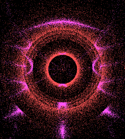 The 24°-lateral arcs are situated at the upper and lower right and at the upper and lower left part of the 24°-halo. Halos which are caused by vertically orientated pyramid-shaped crystals are drawn in violet colour, halos caused by randomly orientated pyramid-shaped crystals are drawn in red.