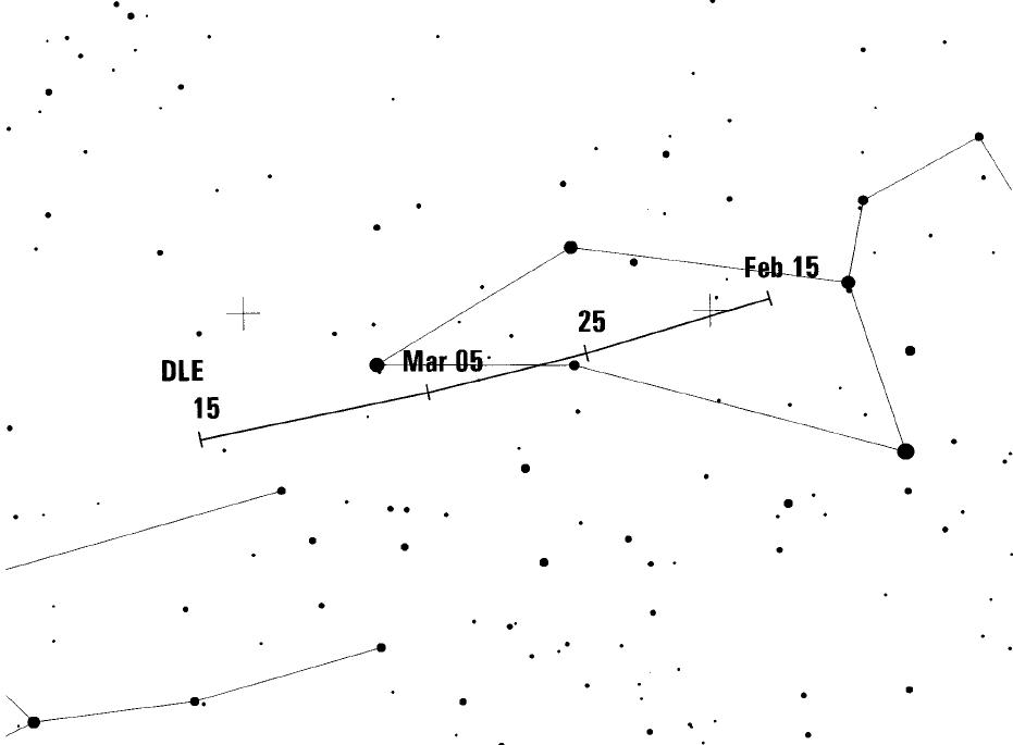 In der zweiten Februarhälfte beginnen die Delta-Leoniden (DLE) ihre ebenfalls geringe Aktivität. Die Raten liegen kaum über 2 Meteore je Stunde - ein Maximum kann man daher auch nicht erwarten. Der in den Listen angegebene Termin (25.2.) ist lediglich Referenzdatum für die Radiantenposition. Der abnehmende Mond stört zwar die Beobachtung, jedoch sind in der ersten Nachthälfte der letzten Monatsdekade Beobachtungen wünschenswert. Aufgrund der ähnlichen geozentrischen Geschwindigkeiten (DLE 23km/s, ANT 30km/s) ist eine genaue Stromzuordnung notwendig, so dass Plotting angesagt ist.