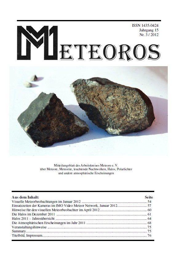 ... zeigt den Meteoriten aus Oslo. Das Gewicht des gezeigten Meteoriten beträgt 585g und ist in das Dach eines Gartenhauses in einer Kleingartenanlage in Oslo (Rodeløkka) eingeschlagen. Vermutlich fand der Fall am 1. März 2012 statt, als um 20:39 Uhr eine helle, detonierende Feuerkugel über Süd-Norwegen beobachtet werden konnte. Das Gartenhaus wurde im Winter nicht betreten, so das der Schaden erst jetzt bemerkt wurde. Ein zweiter, ca. 700g schwerer Meteorit wurde wenige Tage nach dem Gartenhaus-Fund in einem Osloer Park (Ekeberg) aufgefunden. Ersten Untersuchungen zufolge handelt es sich um einen Chondriten.