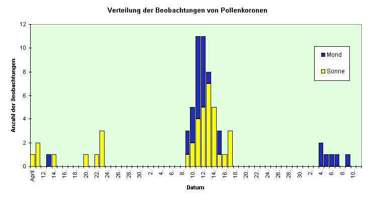 Nachdem in den letzten Jahren nur vier Beobachter kontinuierlich nach Pollenkoronen Ausschau hielten, erreichte uns in diesem Jahr eine ganze Flut an Beobachtungen, besonders vom Zeitraum 9.-17. Mai. Viele berichteten begeistert von ihren ersten Beobachtungen dieser Kranzerscheinung. Ursache für den diesjährigen starken Pollenflug war eine sehr trockene und warme Witterungsperiode Mitte Mai, in dem es einen starken phänologischen Entwicklungsschub gab. Schwache bis mäßige Winde sowie bodennahe Inversionen sorgten für eine relativ gleichmäßige konzentrierte Ausbreitung der unzähligen Pollen, so daß Koronen mit enormer Intensität entstehen konnten.