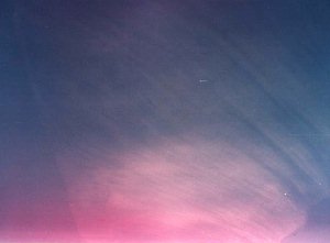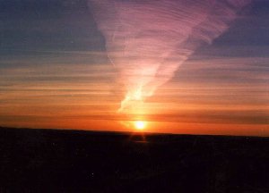 Dieses Phänomen wurde am 13.04. 1997 kurz vor Sonnanaufgang durch zwei am Osthorizont erscheinende sehr große Kondensstreifen sichtbar. Erst nach Sonnenaufgang wurde die ganze Ausdehnung der Wolken erkennbar. Um 06.22 Uhr MESZ entstand die erste Aufnahme, die das cirrusartige Aussehen der Wolken zeigt. Die Farbe war weiß, die Struktur faserig, wellenförmig und am südlichen Rand hakenförmig. Die rötliche Färbung ist ein Effekt der Morgendämmerung. Das Foto zeigt auch, daß es sich um zwei Wolken in unterschiedlichen Höhen handelt, wobei die obere Wolke durch die untere hindurchschimmert. Folglich kann die vertikale Ausdehnung nicht groß sein. Nach 06.36 Uhr waren die Wolken nicht mehr in ihrer Gesamtheit zu sehen und nach 06.50 Uhr waren sie in Richtung Süden abgezogen.